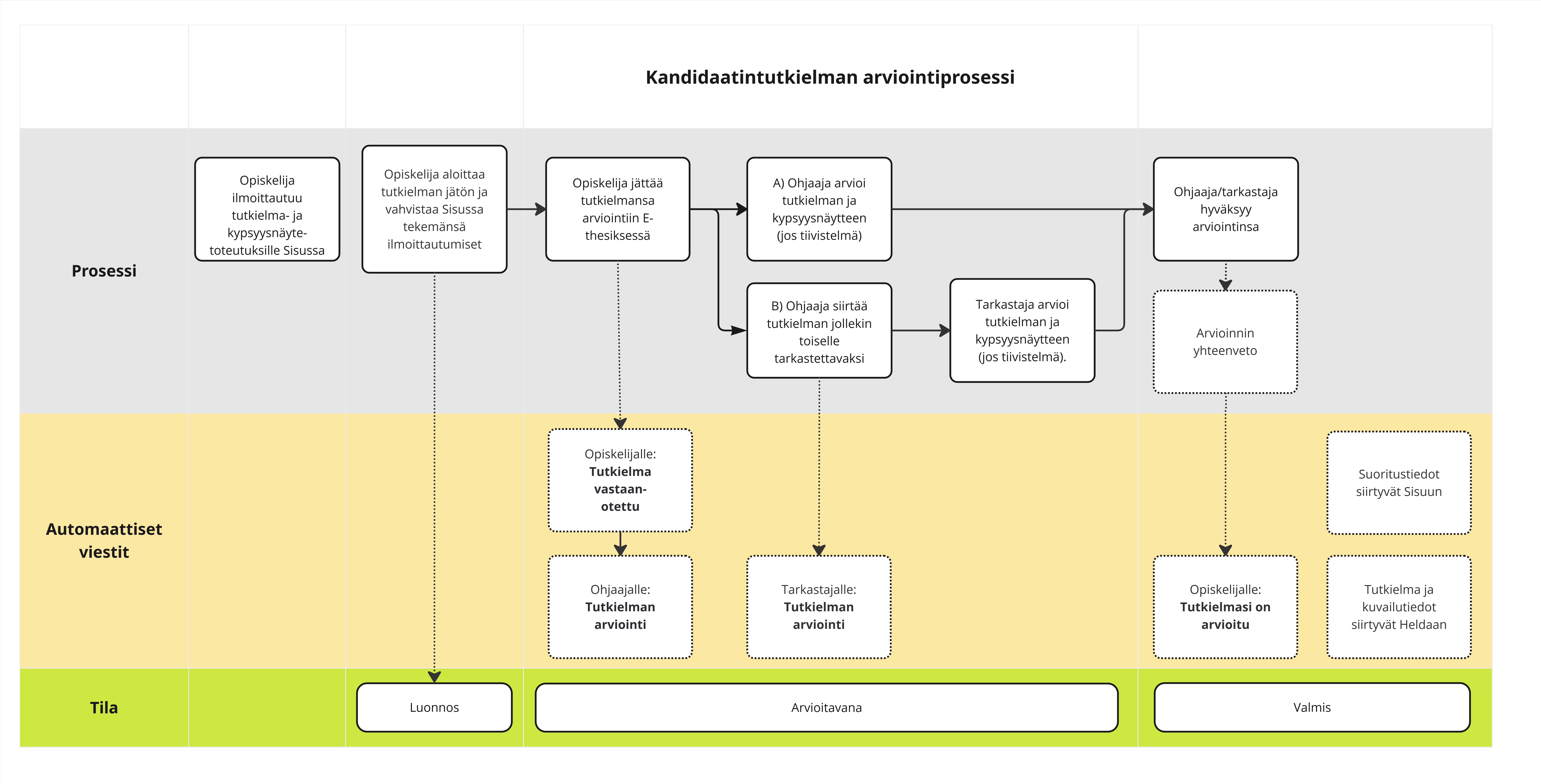 Kun palautat maisterintutkielmasi E-thesikseen, opintohallinto vastaanottaa tutkielmasi ja siirtää sen nimetyille tarkastajille arviointiin. Kun tarkastajat ovat arvioineet tutkielmasi, saat tiedon arvosanasta sähköpostitse.